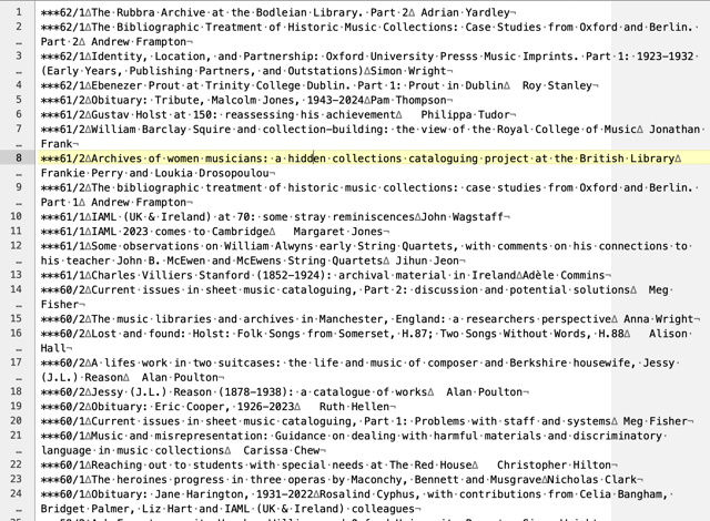 Step one involved scraping the entirety of the Brio list of contents from the website page and pasting the result into a text editor (BBEdit). At this early stage I had to decide whether or not to represent every single entry in the indexes or to concentrate only on articles – including obituaries, however short. The first task then was to search for and selectively remove short miscellanea, entries that referred to reviews, and date-dependent entries.