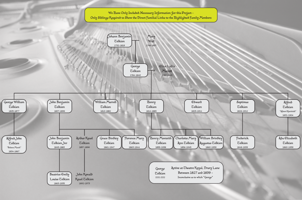 Instantly apparent was that all of the named Tolkiens we were finding to that point, except Frederick, were brothers. The family business of that generation was definitely music – the early research quickly found that the other brothers of that generation ran piano manufacturers, piano tuners and music shops throughout London and Birmingham. The casting of a wider net showed this passed onto future generations, where more names were appearing as performers too.