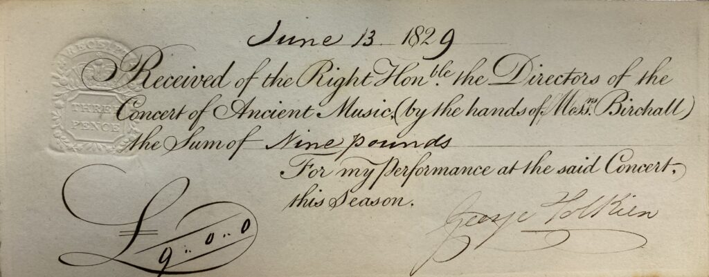 Other interesting mysteries also came to light – one member of the family we were researching was also a bass in the chorus of the Theatre Royal, Drury Lane between 1827 and 1839. The problem was that we could not definitively say which, as the hundreds of listings and playbills only list him as “Mr. Tolkien”. We found a receipt to him saying “George Tolkien”, with a signature, although this could be one of two Tolkiens according to the dates: a father or son. “George”, as in the father of the brothers we were looking at, seems to have spent most of his life as a watch-maker or auctioneer. His son George William was a musician who also went by “George” and so this remains an open and active part of our research.
